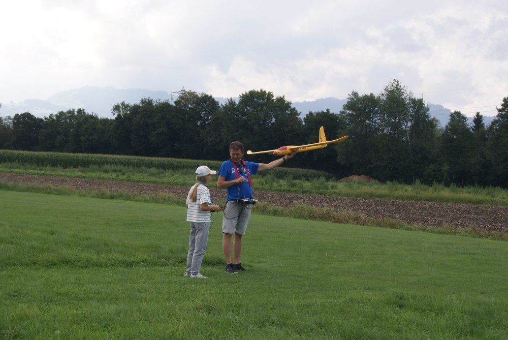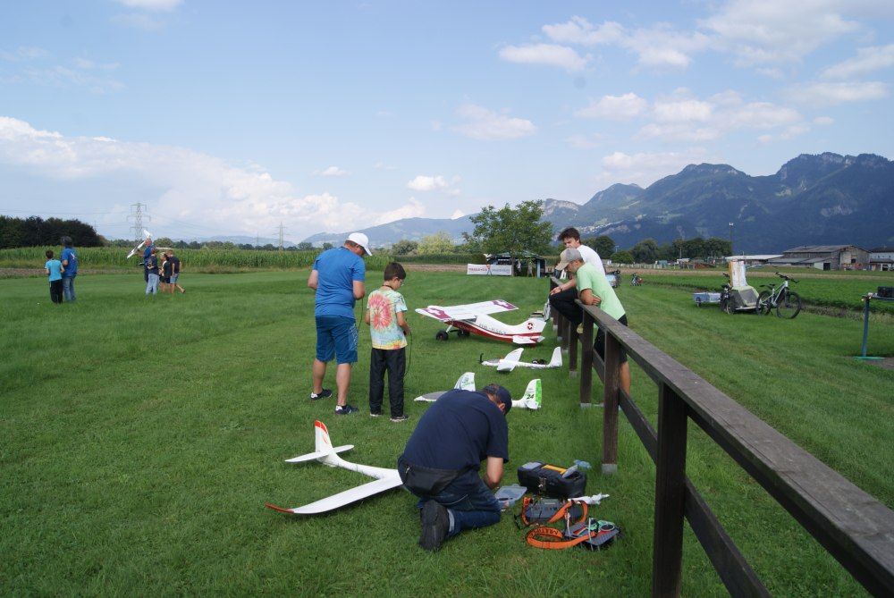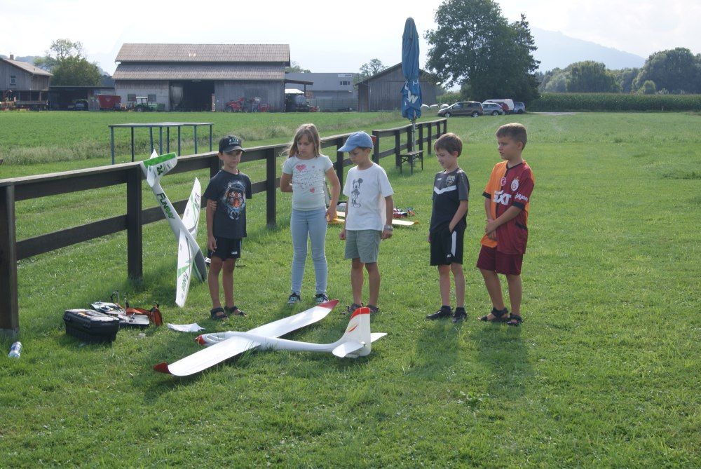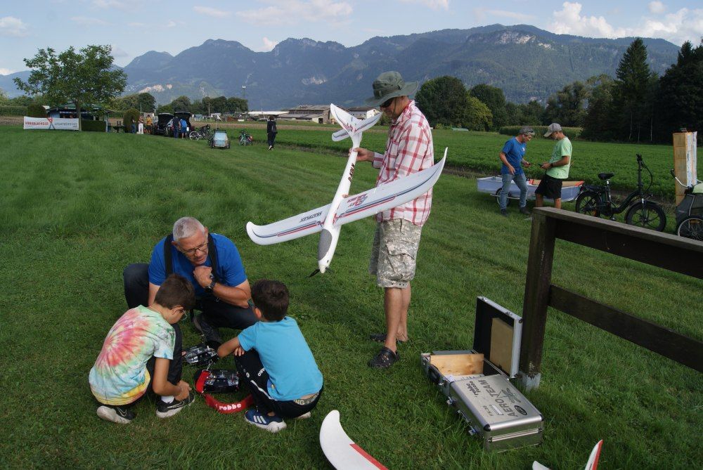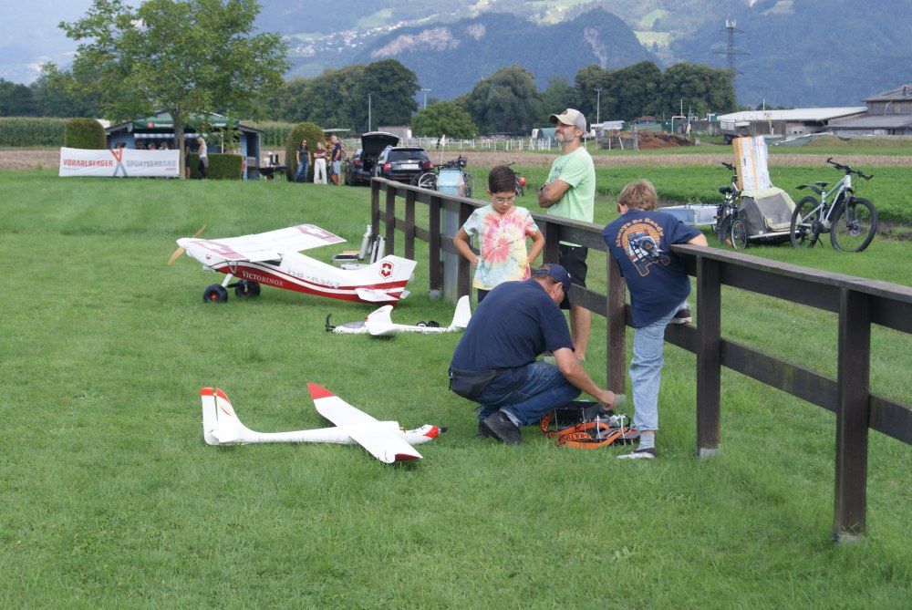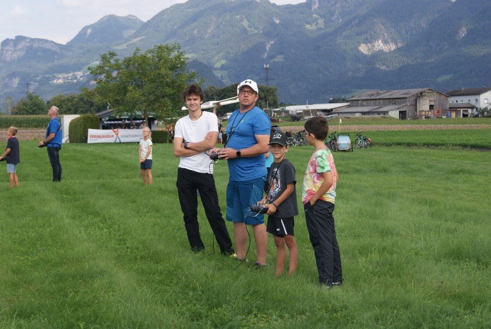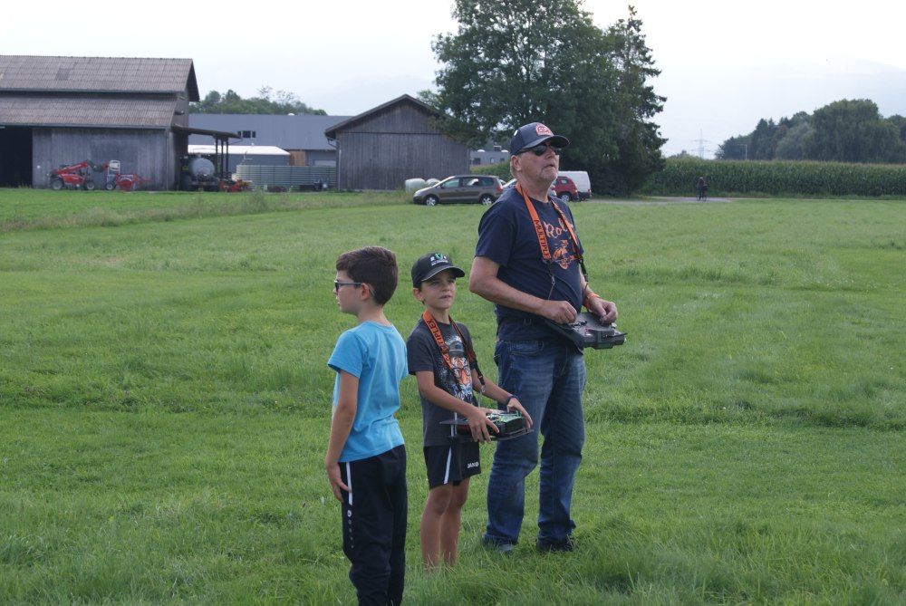 Bekannterweise und über Jahre fördert der MFV-Altach Jugendliche und Nachwuchspiloten. Mit Helmut selbst, Günter, 2 x Peter, Andy, Wolfgang haben alle Fernsteuersysteme mit zwei Sendern. Umschaltbar konnten die Interessierten in der Luft die Modelle übernehmen und sogar selbst steuern.
