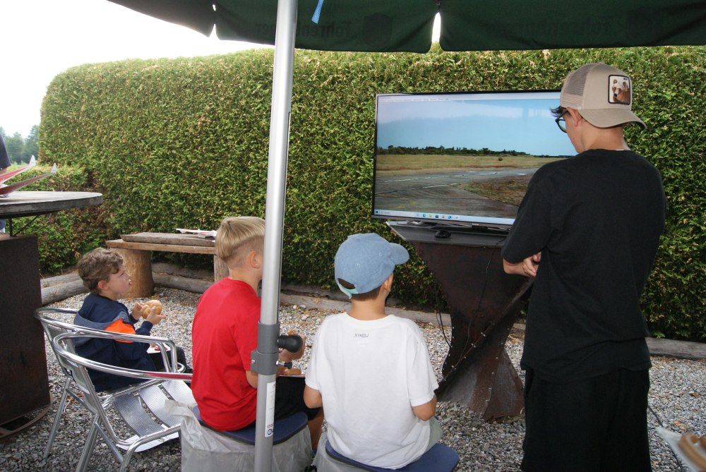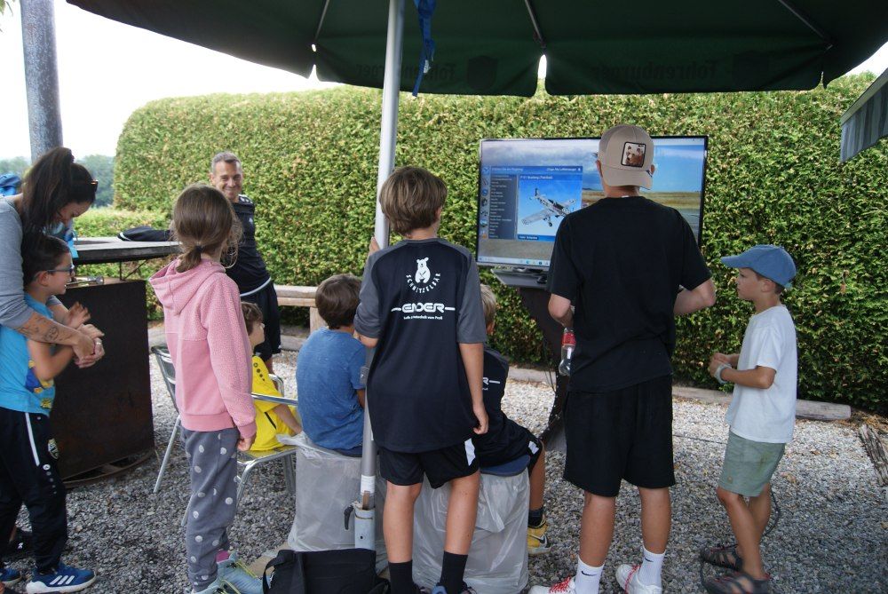 Ganz besonders aber kam der installierte Flugsimulator an, bei dem die verschiedensten Modellarten sehr echt mit einer angeschlossenen Fernsteuerung bewegt werden konnten. So wie viele live mit den Seglern mit Lehrer / Schüler Hilfe mehrfach real geflogen waren, saßen einige x-fach an der Steuerung und vor dem Bildschirm. Hätte man den Simulator nicht später ausgeschaltet, wären einige die halbe Nacht begeistert weiter geflogen.